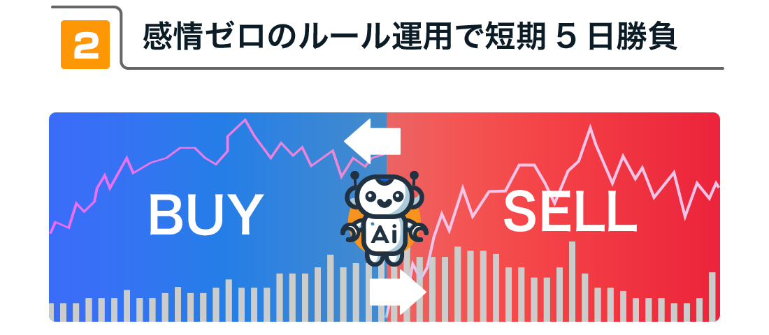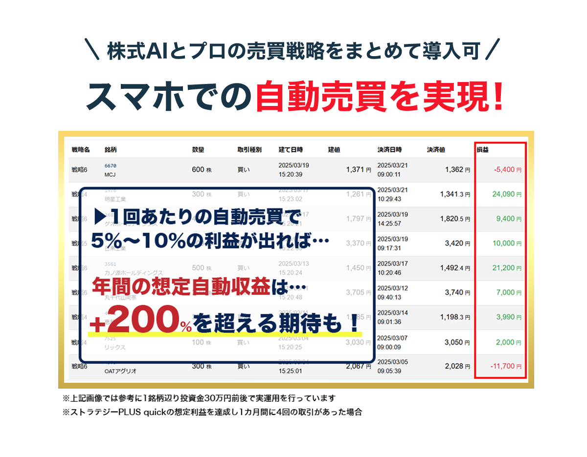 AI銘柄スクリーナーが見つけた銘柄を、プロが実際に使うような高度な売買ロジックで自動運用します。プロレベルの手法を取り入れることで、素早く適切な売買判断を実現します。