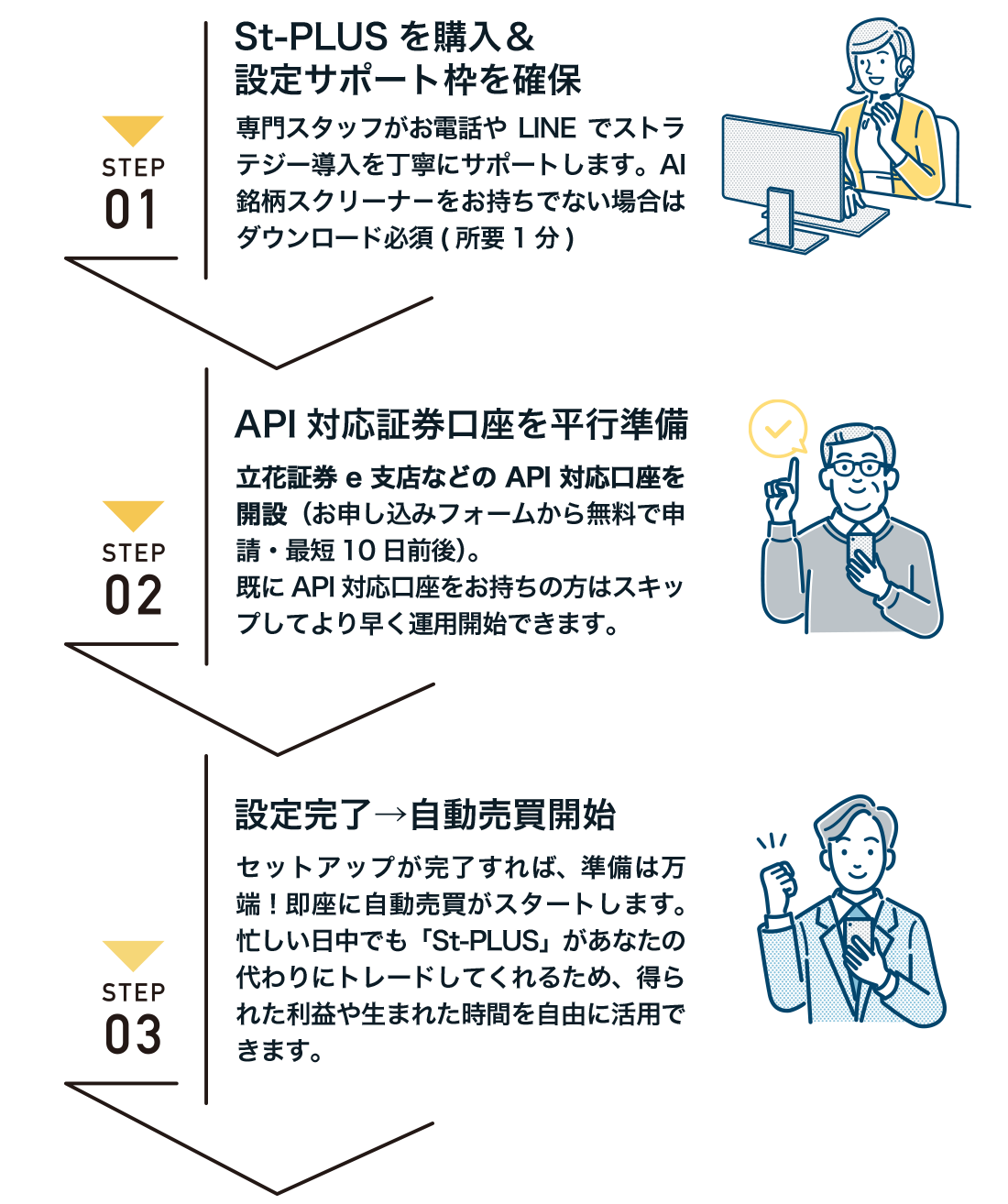 ご安心ください。「St-PLUS」はどなたでも迷わず使えるよう設計されています。初期設定時には専門スタッフが電話やLINEで丁寧にサポートいたしますし、一度セットアップしてしまえばあとは日々のログインのみでアプリが自動で売買を行います。パソコンが苦手な方や投資初心者の方でも、戸惑うことなくお使いいただけます。