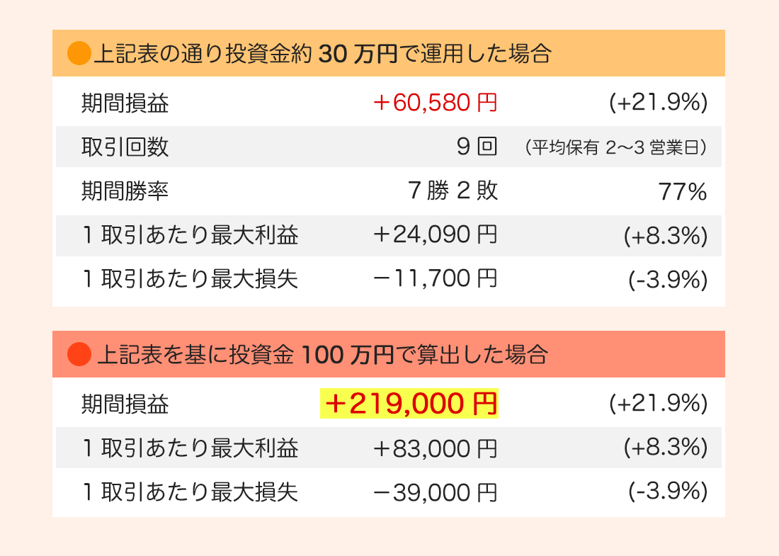 他社の類似サービスが年間数%の利益を目標にする中、「St-PLUS」は1~5営業日の短期取引に特化し、より迅速な成果を追求します。 過去のデータ検証で有効性が確認された実績あるストラテジーを採用しており、裏付けのある戦略で運用します。