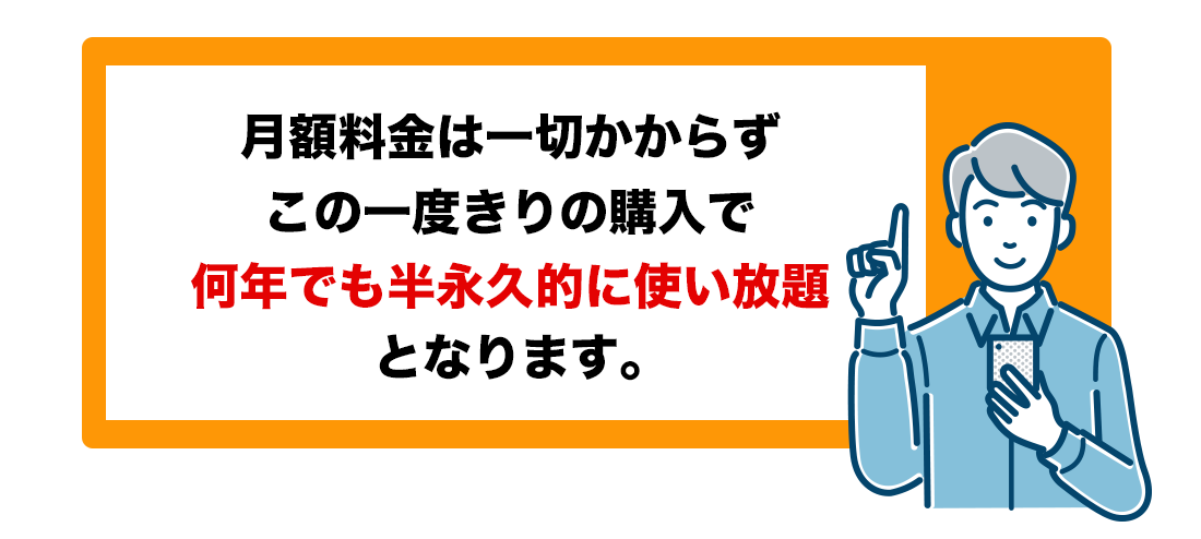 使用期限なし! 一度導入すれば何年でも継続利用可能な買い切り型サービスです。 継続的に費用の掛かる月額制サービスではないので、長期的に見ればコストパフォーマンスは抜群です。