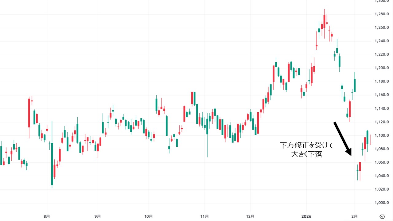 これを受けて、株価は2月2日の終値1,165.0円から2月4日の終値1,047.5円まで、1日で10.8%下落しました。