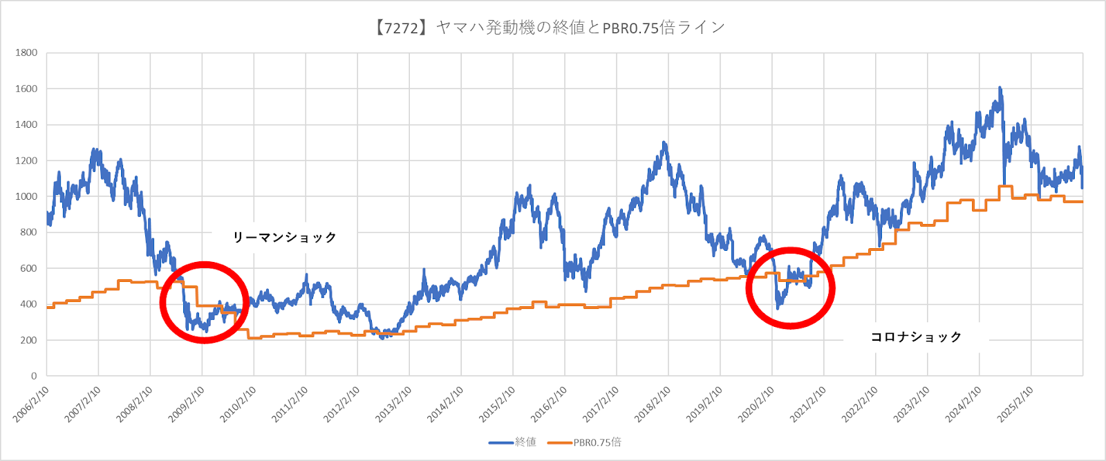 ▼以下のチャートには、ヤマハ発動機の株価と、PBR0.75倍となる株価を結んだラインを示しています。