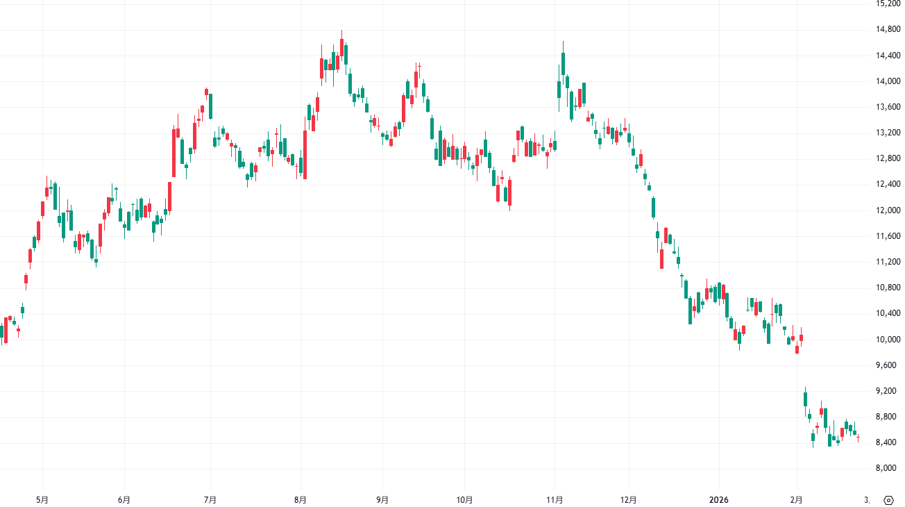 しかし、昨年12月頃から下落トレンドに転じ、2026年2月6日には8,326円まで下落。