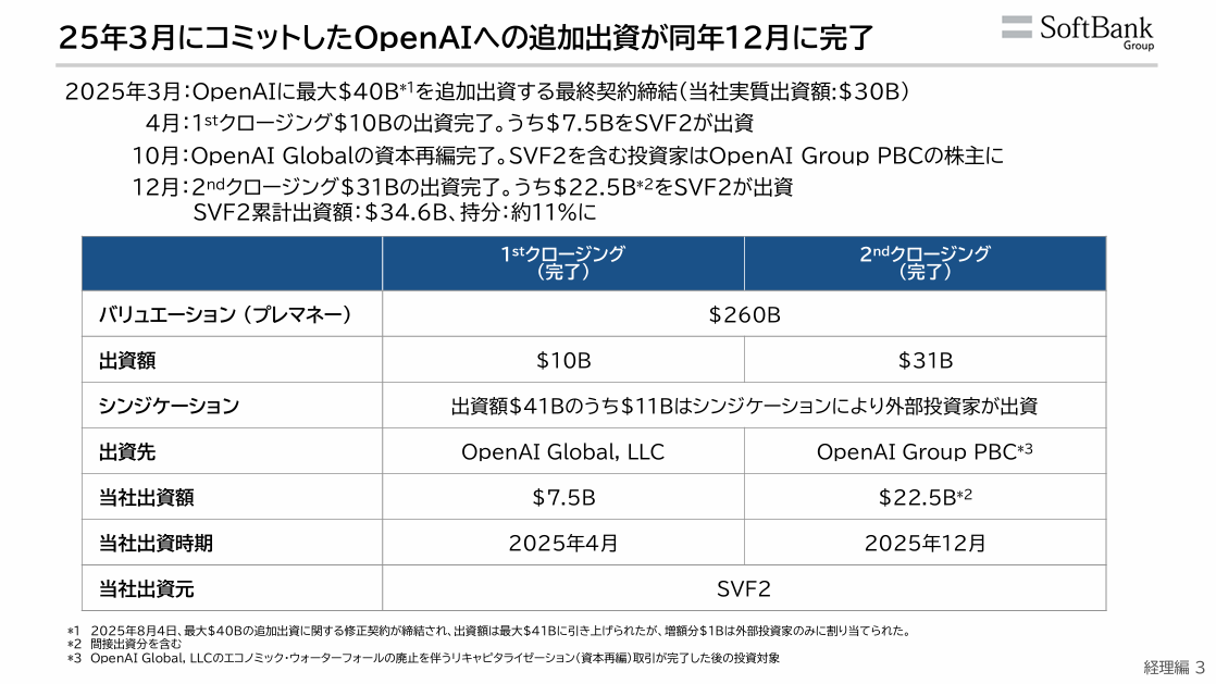 ▼ソフトバンクグループは2025年12月までにOpenAIに対して累計346億ドル(約5.3兆円)を投じ、持分比率約11%の大株主となっています。