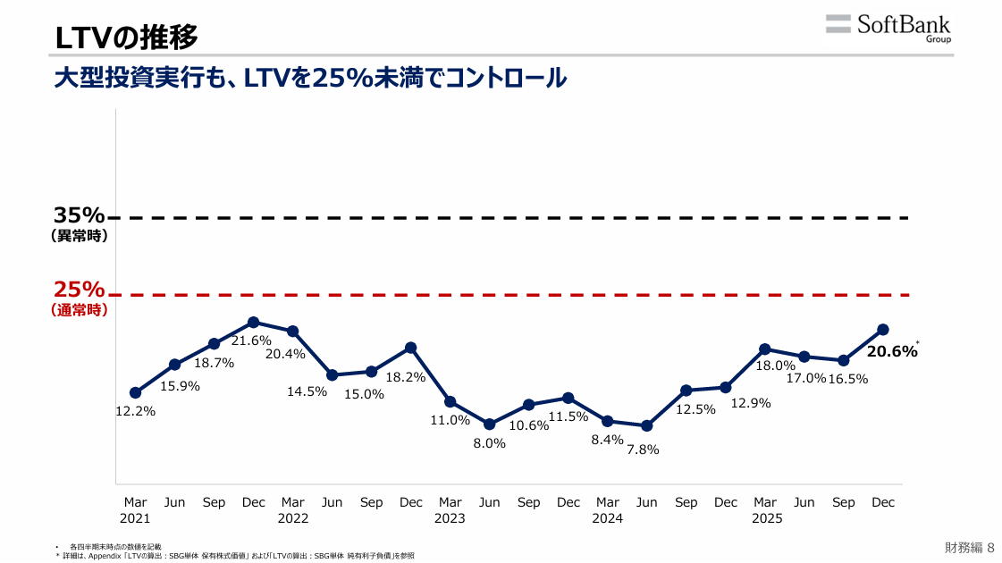 ▼たとえば、ソフトバンクグループが重視する財務指標であるLTV(Loan to Value:保有株式価値に対する純負債の割合)は、25%未満でコントロールされています。