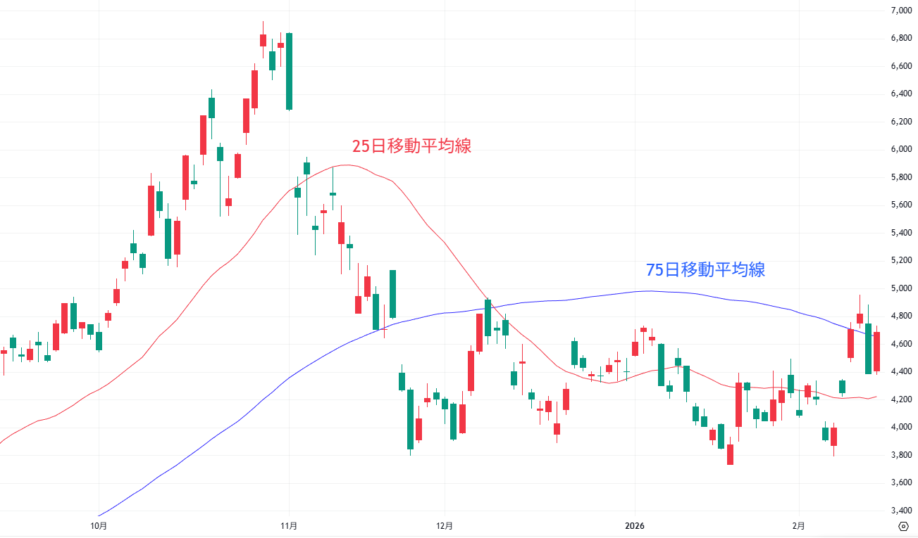 もうしばらく4,000円台で乱高下しながら、OpenAIやアームに関連した好材料を待つような値動きをメインシナリオとして考えておくのが良いでしょう。