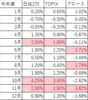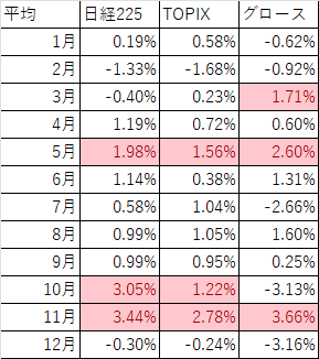 1月の他にも4月、7月、11月の平均騰落率がプラスとなっており、1月が特別強いとは言えないかもしれません。日経、TOPIX、グロースともに5月と11月が高くなっています。
