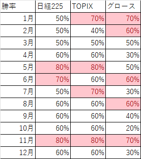 1月の日経平均・TOPIX・グロースの勝率