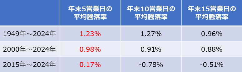 いずれの期間も、年末5営業日の平均騰落率が高くなっています。