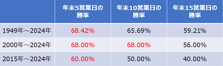 こちらも年末5営業日の勝率がもっとも高くなっています。