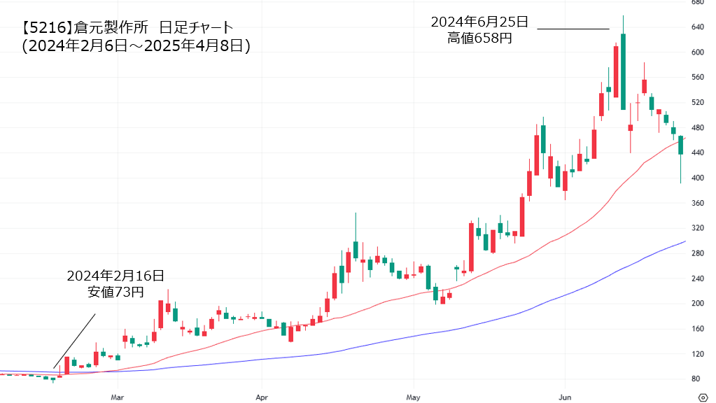 ▼これを好感して、株価は2024年2月16日の安値73円から、同年6月13日の高値658円まで9倍超の上昇を見せました。