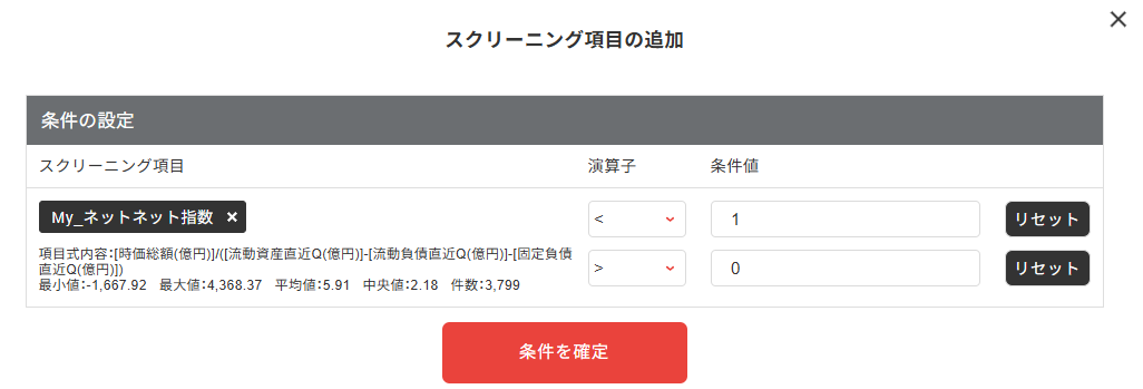 手順5:新たな項目である「My_ネットネット指数」をクリックし、「演算子」の部分で「<」を選択し、横の「条件値」に「1」と入力します。