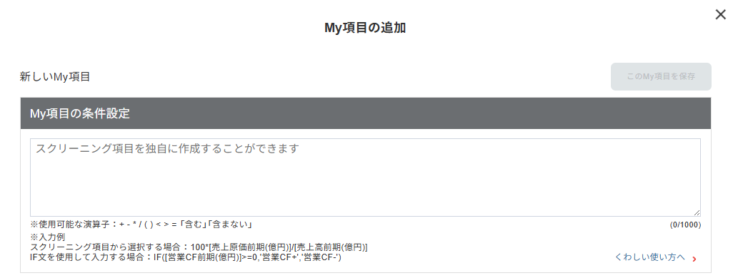 「My項目」をクリックすると出てくる「新規追加+」をクリックすると、「スクリーニング項目を独自に作成することができます」と書いてあるテキストボックスが出てきます。