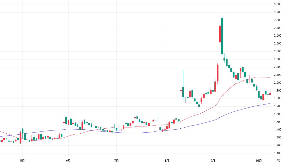株価は2025年1月につけた安値1,001円から同年9月5日の2,858円まで、1年足らずで2.85倍の上昇を見せました。