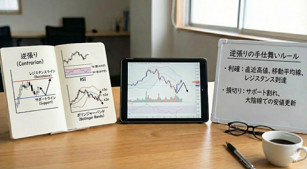 チャート形状やサポートライン、出来高などと組み合わせて、複数条件が揃ったときだけ逆張りするといったルールにしておくと精度が上がります。