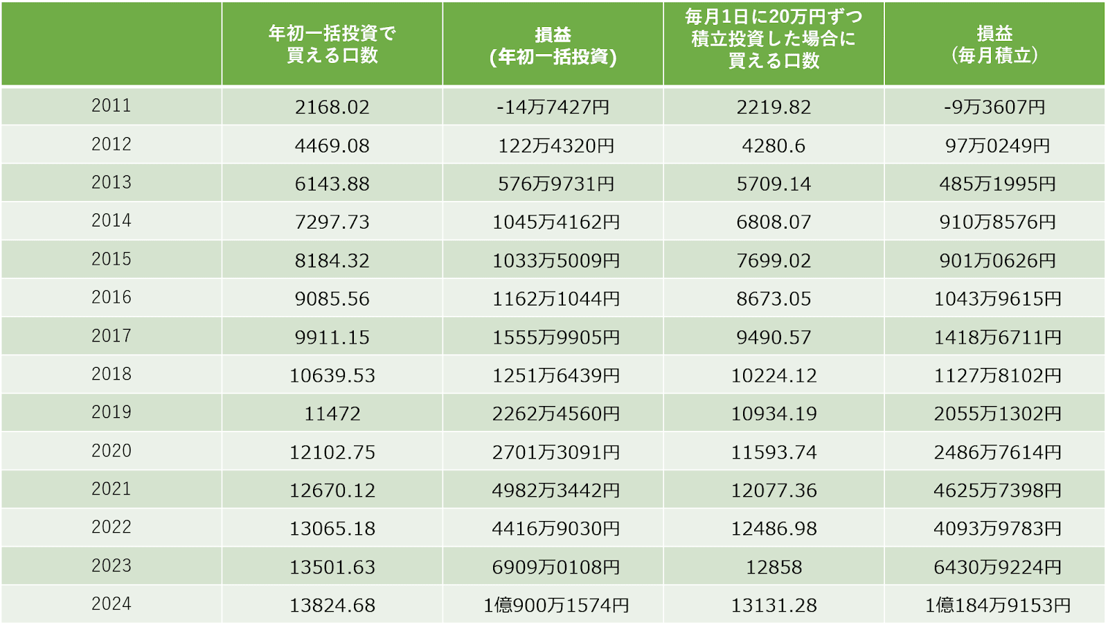 ▼1月の最初の営業日に240万円分一括で投資した場合と、毎月1日に20万円分ずつ投資した場合に買える口数(株数)とその年の末時点での損益を表にしています。