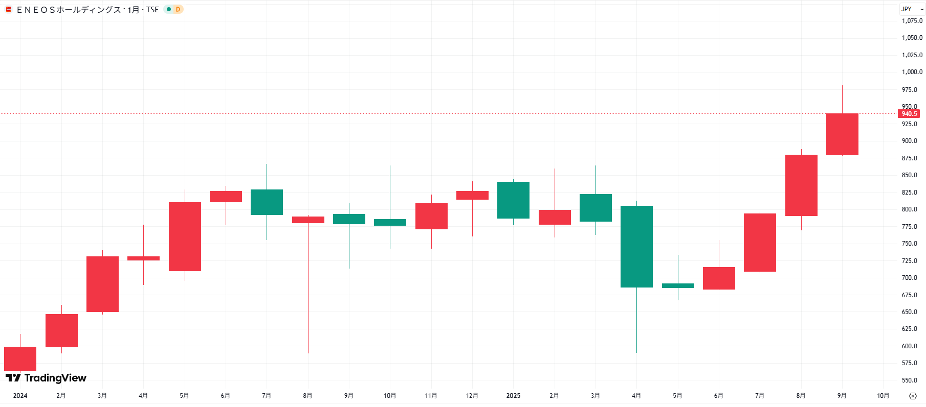 国内最大級のエネルギー企業であるENEOSは、石油依存からの脱却を掲げ、洋上風力や水素事業に積極的に参入しています。従来の石油精製・販売に加えて再エネ事業を拡大しており、大手ならではの資金力と技術力が強みです。エネルギー転換の流れをリードする存在として、投資家の関心が集まりやすい状況です。