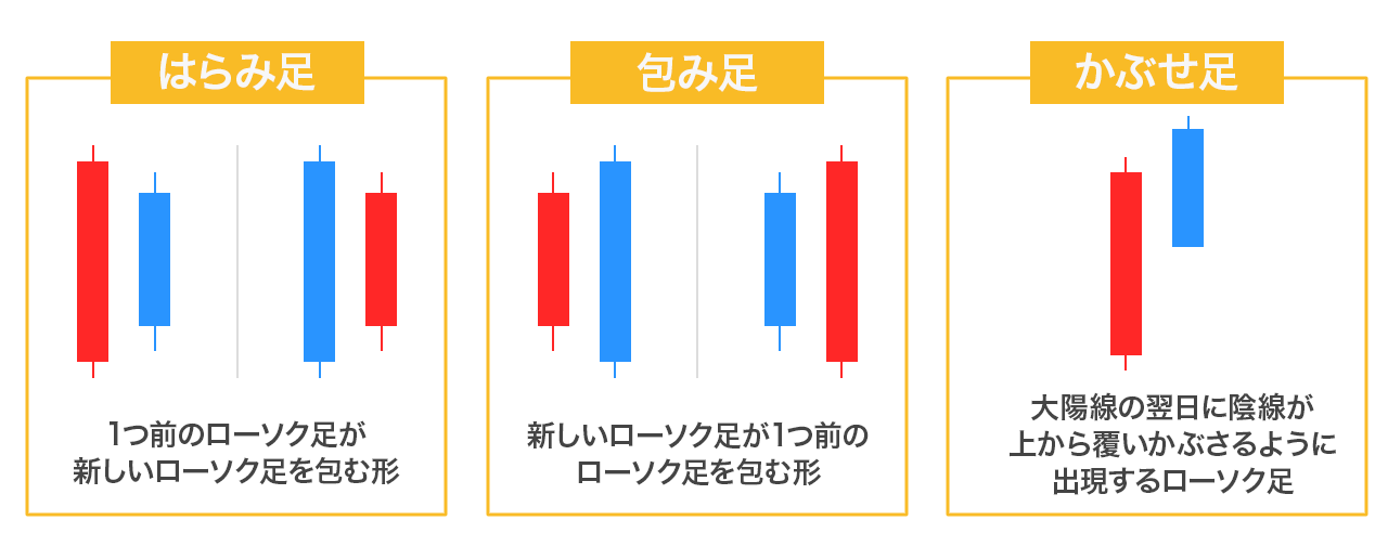 2本足以上のローソク足の組み合わせにも、いくつかのパターンがありますので、併せて押さえておくと良いでしょう。