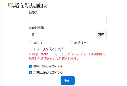 トレスタでは、自動売買の条件を設定する場所として「戦略ルーム」が用意されています。ここでは、投資金額や損切り・利確といった、比較的シンプルな決済条件を設定します。