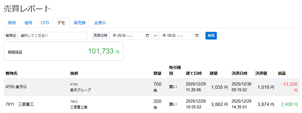 売買が完了した銘柄については、「売買レポート」の画面で一覧として確認できます。どの銘柄が、どのタイミングで売買されたのかを、後から落ち着いて振り返ることができます。