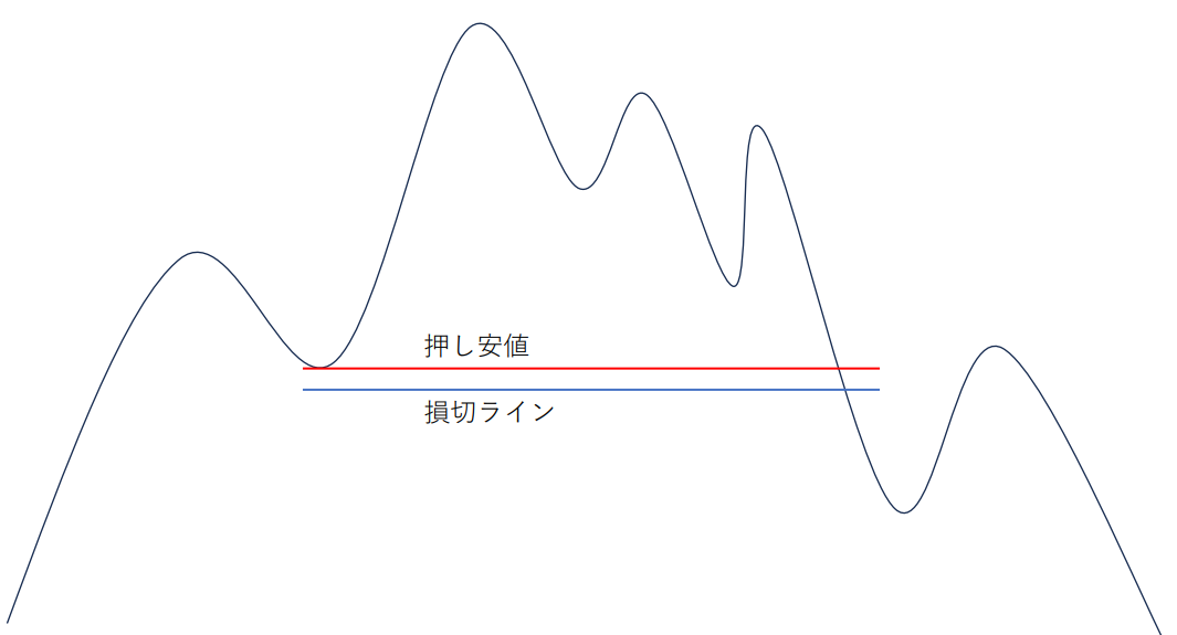 買いポジションを持っている場合、損切りは「上昇トレンドが崩れるポイント」、つまり直近の安値(押し安値)の少し下に設定します。
